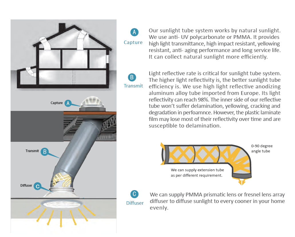 Está hecho de aleación de aluminio con recubrimiento de fluorocarbono que es resistente a la corrosión. Sin fisuras, la base de una pieza parpadea está diseñada para evitar las posibles fugas de agua. Se puede instalar en el bordillo o techo de techo directamente. El tipo B viene con un tubo rígido de aleación de aleación de aluminio reflectante. Varipitch y tubo de ángulo de 90 grados están disponibles para trabajar con cualquier techo para una fácil instalación.